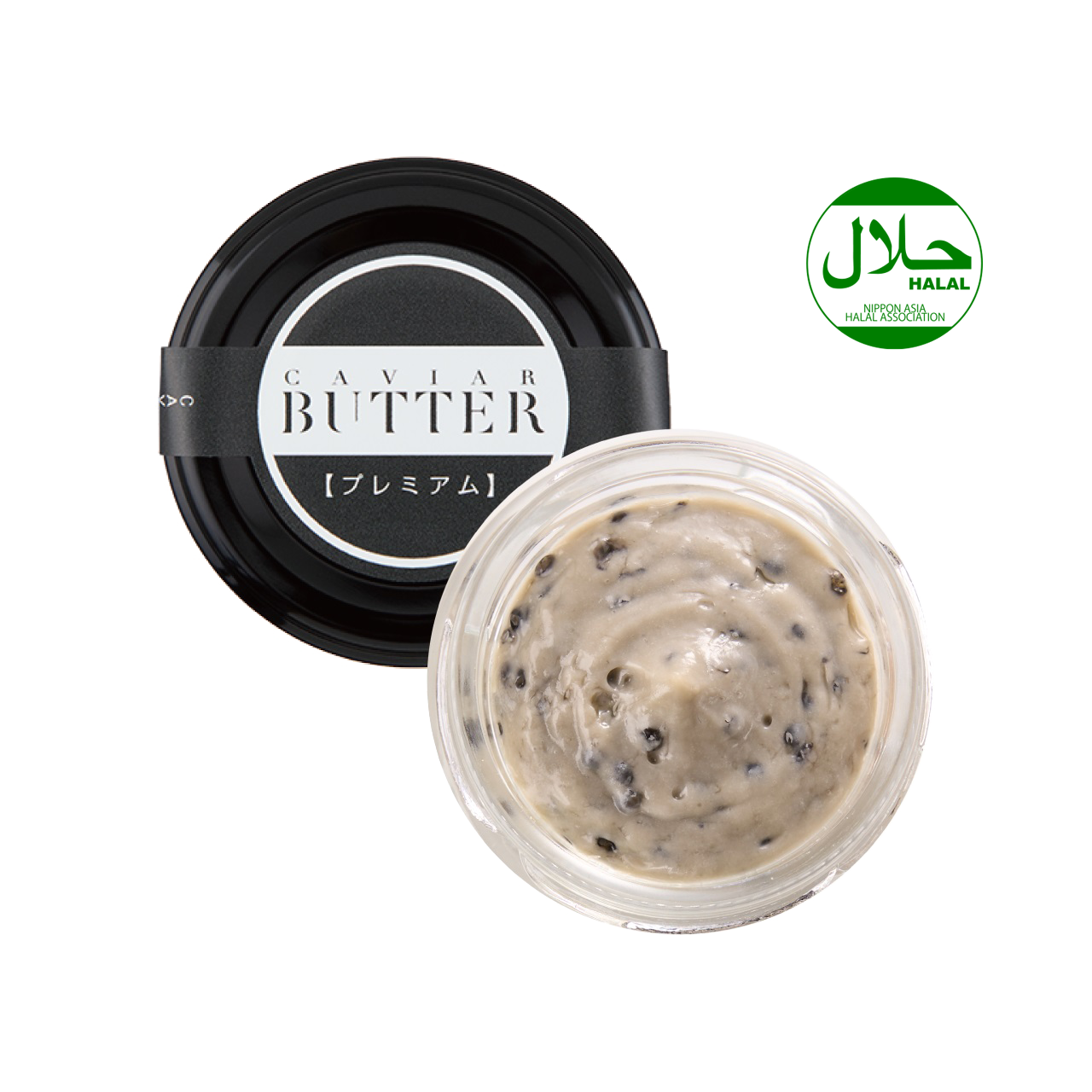 ●キャビアバター〔プレミアム〕 バターにもキャビアをたっぷりと練りこみ、粒のキャビアも混ぜ込んだ、キャビアの風味をしっかりと感じられる特別なキャビアバターです。