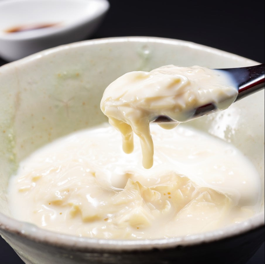 スプーンで食べる、とろけるような食感の生湯葉。豆乳をたっぷり含んで、クリーミーな味わいが特徴です。当社の商品の中で最も柔らかい食感で、卵かけご飯や湯葉丼、デザートにも適しています。